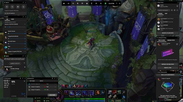 微软还为你提供了额外的工具,比如Windows 11和Windows 10默认安装有Xbox游戏栏应用程序,可以使你的游戏中的体验更好。在其它方面,游戏模式和Xbox游戏栏允许你记录你的游戏,控制诸如声音的大小,与你的朋友聊天,监控你的计算机的性能,或播放Spotify的音乐。通过使用Xbox游戏栏可以直接从游戏中打开一些程序,这样就不必在需要在各种应用程序之间切换时回到电脑桌面。如覆盖在英雄联盟游戏界面上的XBox游戏栏: