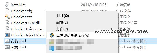 1、将unlocker解压到任意目录,然后右键“安装.cmd”选择“以管理员身份运行”。安装完之后unlocker会集成到右键菜单中。