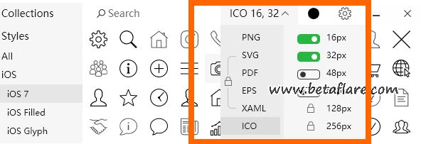 - 提供PNG、SVG、PDF、EPS、XAML、ICO多种图标格式