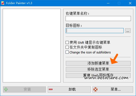 4、重新打开FolderPainter,右侧选择“添加新建菜单”,可以在上方的“右键菜单名称”中更改显示的名称,比如Office风格图标或者扁平图标之类的名字。