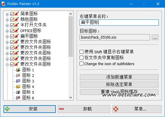 1、打开FolderPainter,在左侧选定文件夹图标组,然后在右侧选择“移除选定菜单”。依次将这三组默认图标移除。