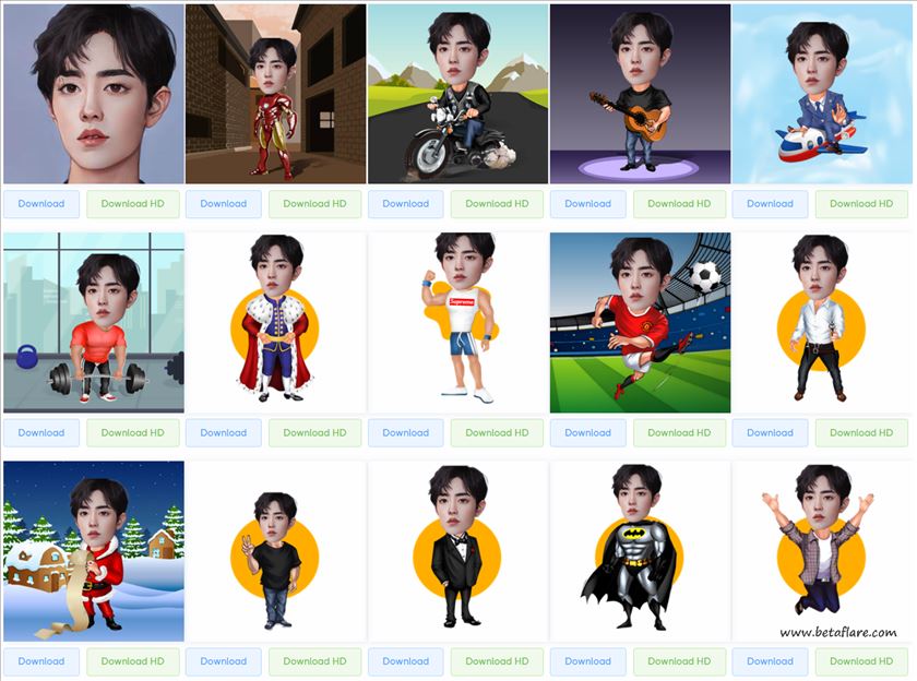 3、这里上传一张人见人爱的明星肖战图片(仅做为演示)。几秒钟之后就生成了帅气的肖战卡通头像和不同造型的肖战卡通造型。