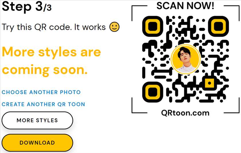 4、QRtoon差不多几秒钟时间就生成了卡通化二维码,右侧可以预览。也可以选择“CHOOSE ANOTHER PHOTO”再换一张照片制作,如果需要换不同的风格可以选择“MORE STYLES”。