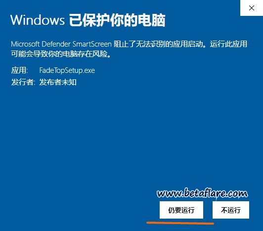 这时会看到“应用:FadeTopSetup.exe”的字样。在下方选择“仍要运行”。