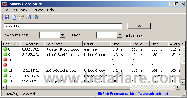 CountryTraceRoute 在测试目录网址时以列表的形式显示出来(如下图)。阻塞的节点路由以红色标示出来。不想用命令的同学可以试试,不错的网络测试工具。