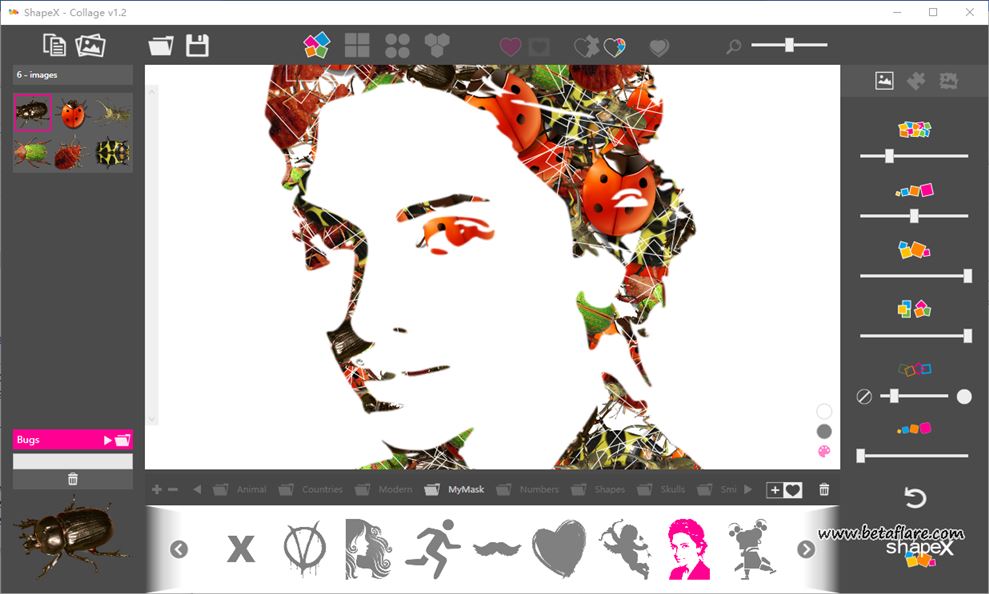 ShapeX使您可以轻松创建各种形状的自定义照片拼贴图。您可以从组织成几种不同类别(动物,数字,摘要,文本等)的各种形状蒙版中进行选择。 只需选择用于拼贴的图像,然后单击不同的形状蒙版即可立即预览结果。比如将多张图片拼成一张迈克杰克逊图片: 功能特性 可以通过调整图像间距,图片的...